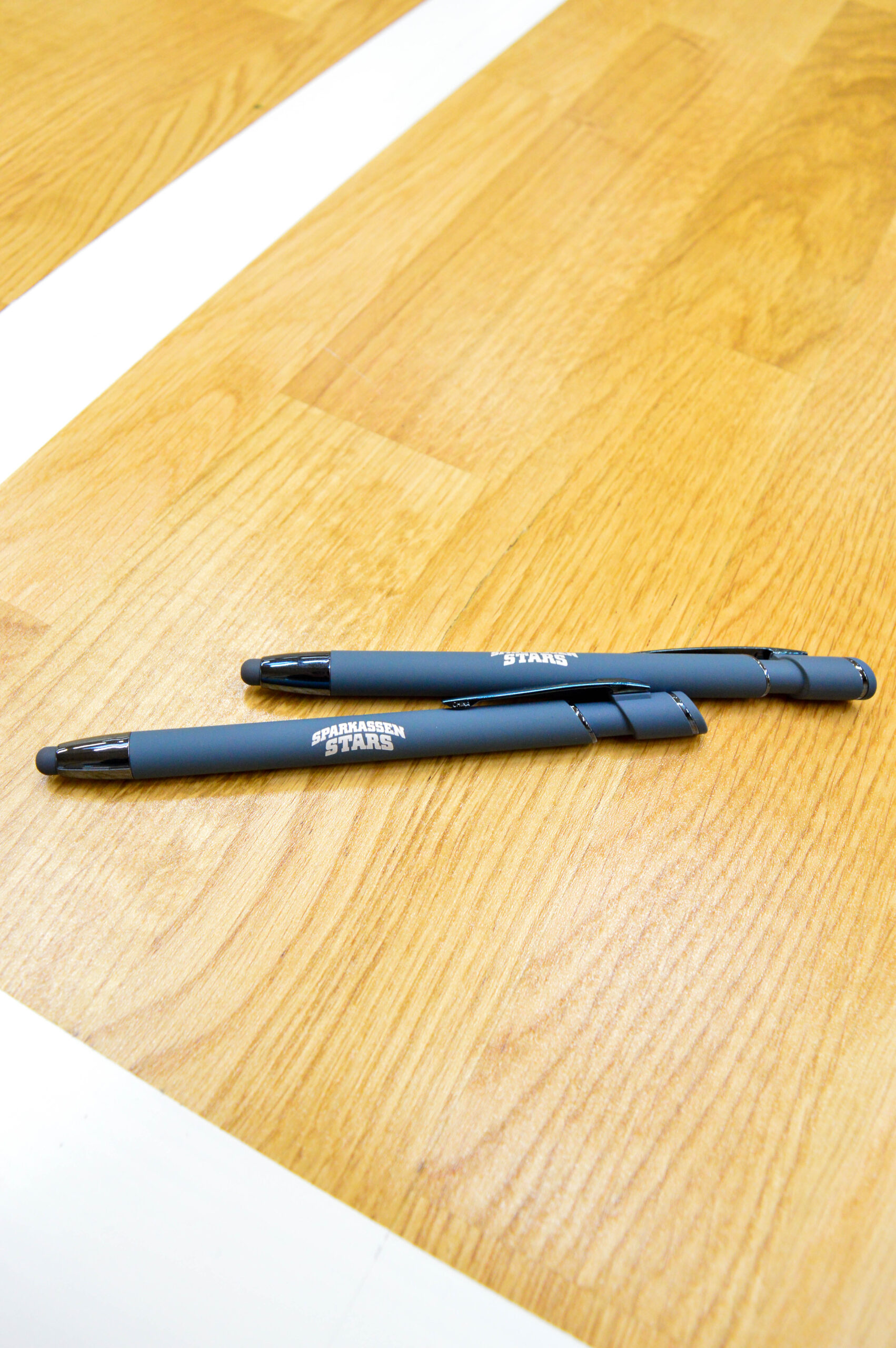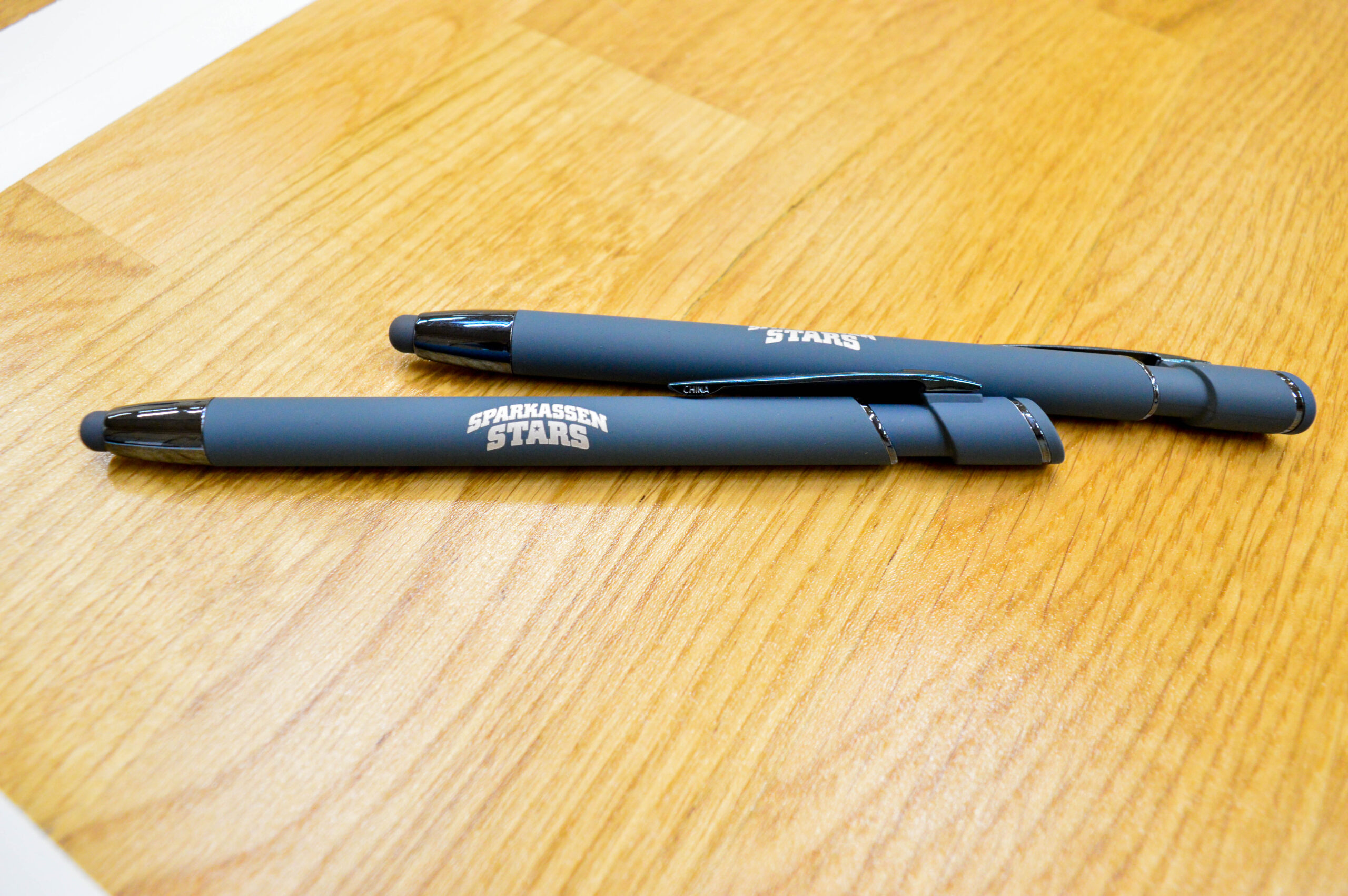 Der SparkassenStars-Kuli ist in Marineblau gehalten und besitzt eine silberfarbene Lasergravur des SparkassenStars-Schriftzuges auf dem Metallgehäuse. Der Kugelschreiber wird in einer schwarzen Einschubhülle geliefert.